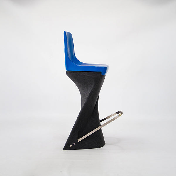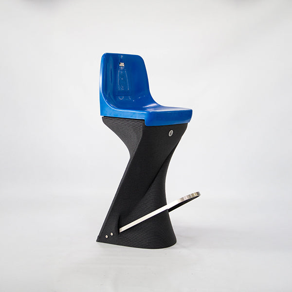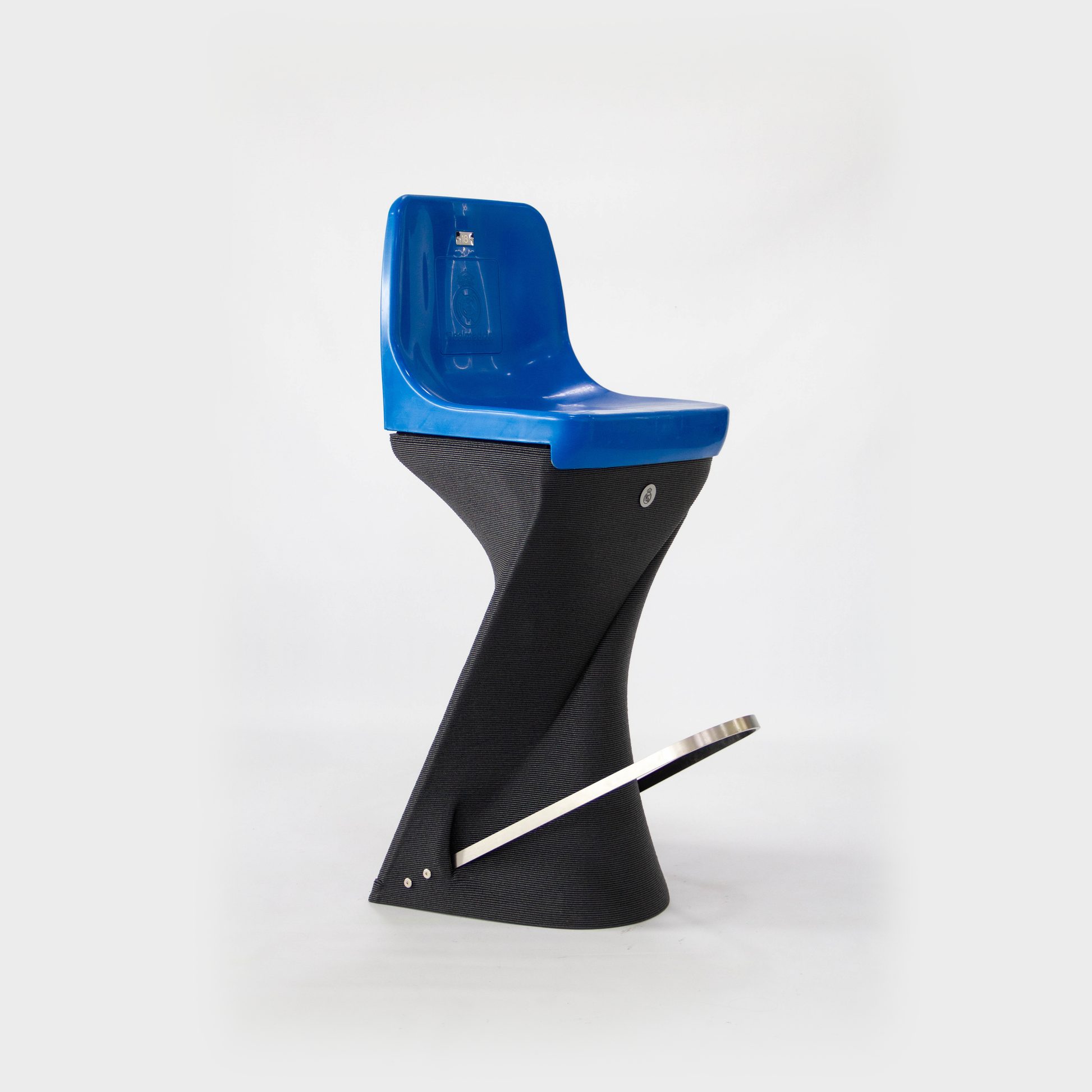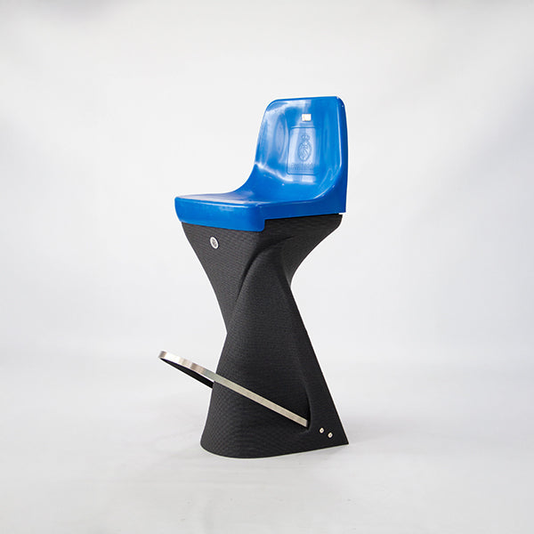 Asiento original con escudo de Real Madrid, procedente del Estadio Santiago Bernabéu, con base de taburete alto fabricado mediante impresión 3D robótica.